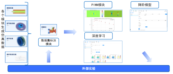 平台将实现虚拟仿真试验的应用与服务。通过完善虚拟试验系统的模型库、前后处理等模块,构建开放的、国产自主可控虚拟试验系统仿真平台,支持相关商业软件求解器、OpenFoam等开源求解器、基于深度学习的虚拟试验模块,同时满足数据与机理融合驱动的建模仿真操作;基于代理模型和神经网络模型,开发流场降阶预测模块,满足快速、高效仿真预测需求;通过求解器标准化、测试与仿真等研发数据集,为项目提供共享服务奠定基础。虚拟试验系统平台的建设应包括虚拟试验系统仿真平台的相关模块、求解器标准化相关模块以及基于物理神经网络的数据科学相关模块。