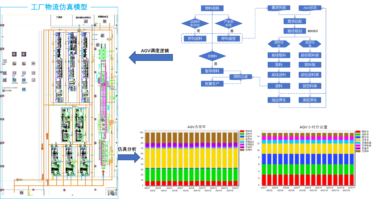 基于构建的工厂物流仿真模型,实现物流全流程动态仿真。通过对物流方案的整体评估实现: