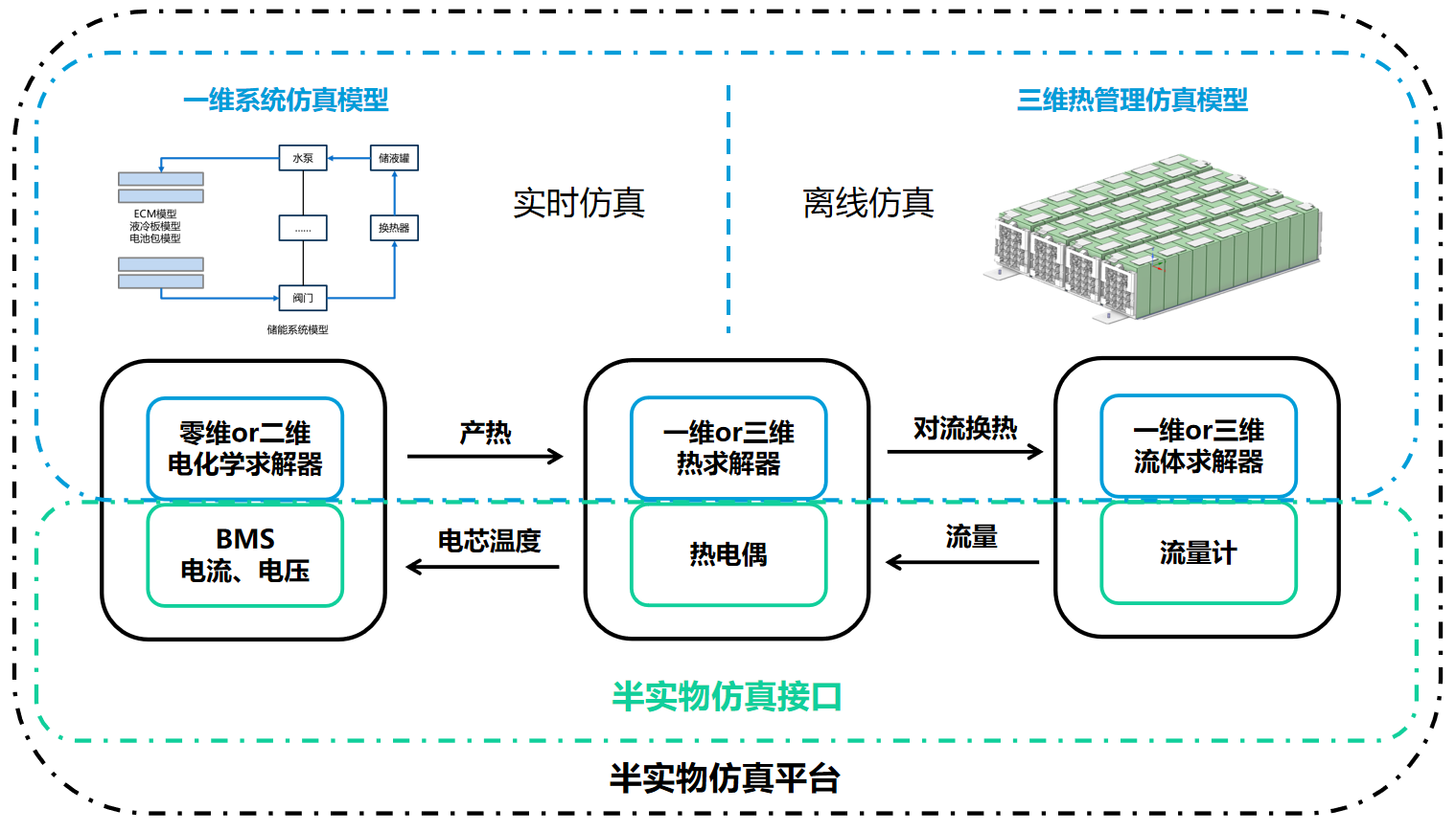 一维系统仿真模型计算电芯电性能结果、三维热管理仿真模型计算电芯热分布与管路流量分布,通过接入BMS中的电流与电压数据、热电偶中的温度数据与流量计中流量数据,优化模型参数提升模型计算结果的精度,实现半实物仿真技术闭环。