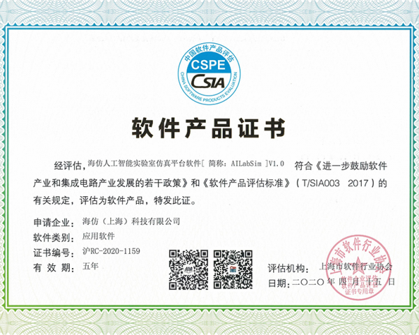 软件产品证书-海仿人工智能实验室仿真平台软件