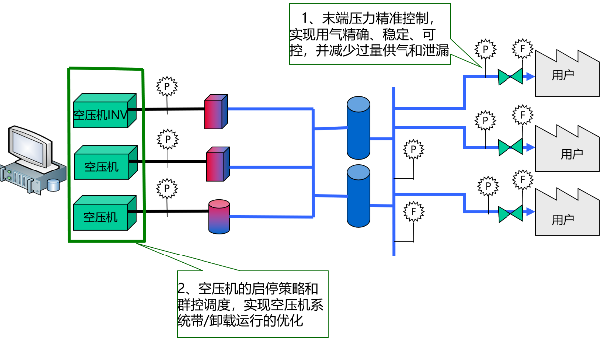 压缩空气系统精准管控节能的基本原理是:应用“精准控制”技术,对压缩空气系统每一个环节的运行工况进行最优化的控制,达到系统“节能、安定”的目的。